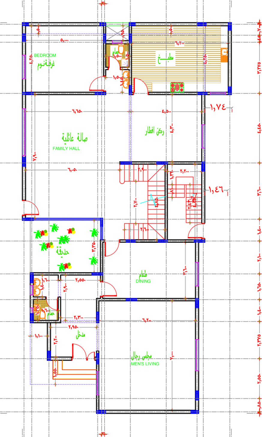 الدرج الداخلي / مجلس ارجال _ دورة مياة مع مغاسله _ مقلط وباب سحب يفصل بين المقلط والصاله _ صالتين مقابله بعض _ مطبخ _ غرفة كبار السن _ دورة مياة بمغاسله تخدم الصاله وغرفة كبار السن جلسة حديقه جانبيه